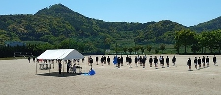 - 6月20日(金)の5,6時間目に全校生徒を対象としてAED講習会が行われました。講師として平戸消防署中津良出張所の隊員の皆さんにお越しいただき、もしものときの対応をていねいに教えていただきました。