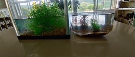 - 3年生の生徒から提供しもらい、成体のメダカ5尾と幼体5尾を飼育し始めました。学校生活の中で生徒の癒しになればと、生徒玄関に水槽を設置しています。来校される際にはぜひご覧ください。