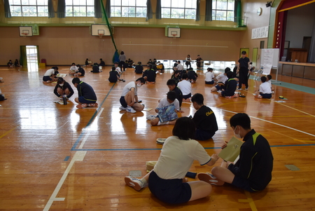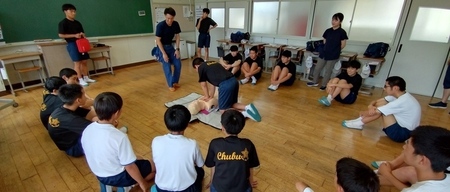 - 6月20日(金)の5,6時間目に全校生徒を対象としてAED講習会が行われました。講師として平戸消防署中津良出張所の隊員の皆さんにお越しいただき、もしものときの対応をていねいに教えていただきました。