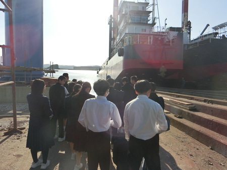 - 11月21日(金)の1〜4校時に2年生の総合的な学習の時間として、企業見学バスツアーを行いました。平戸市の商工物産課の方も同行していただき、市内の企業である山内造船株式会社とアリエス株式会社の2社を見学させていただきました。