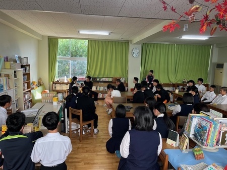 - 読書週間の取り組みで文化委員会による生徒への読み聞かせを行いました。昼休みに多くの生徒が図書室に集まり、読み聞かせに耳を傾けました。