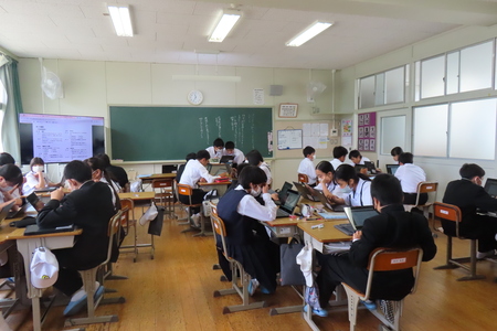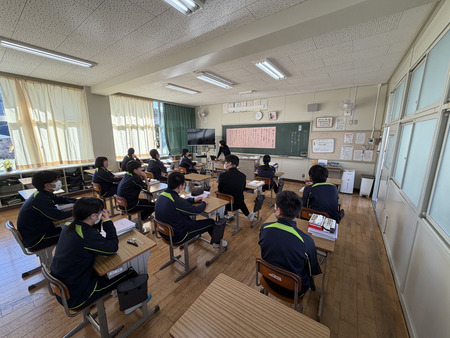 - 本日12月5日(金)に、授業参観を行いました。1年1組は社会、2年1組は数学、3年1組は国語、全学年2組は美術の授業を行い、人数が少ない中ではありましたが、生徒たちは元気よく取り組みました。