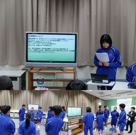 生徒会入会式では、役員が中学校生活について詳しく説明しました。その後の交流タイムでは、新入生からの質問に上級生が答えたり、..