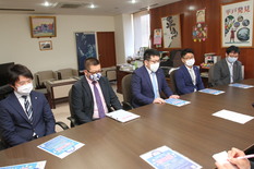 この日は、青年部会長の井芹裕貴さんらが市長室を訪れ、専務理事の福田竜也さんなどから普来袋の企画の趣旨や内容についての説明が行われました。