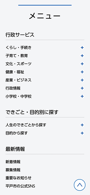 右上のメニューボタンをタッチすると、「くらしの手続き」「子育て教育」「健康福祉」「文化スポーツ」「産業ビジネス」「平戸市行政情報」「目的から探す」「人生のできごとから探す」のカテゴリメニューから分野別に情報を探すことができます。
