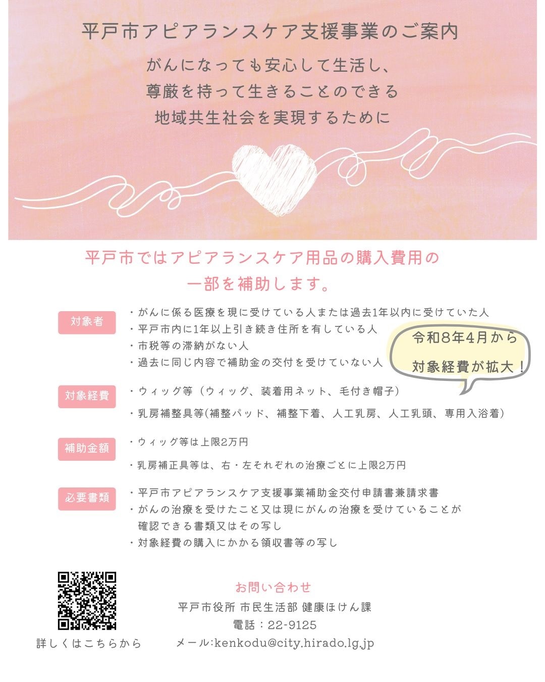 がんになっても安心して生活し、尊厳を持って生きることのできる地域共生社会を実現するため、ウィッグや乳房補整具等を購入する費用の一部を補助します。