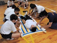 体験後に、移送法や水難救助について、消防署の方から指導していただきました。