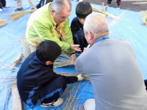 - 老人会や保護者の方の協力を得て、今年度もたけわら細工教室を行いました。老人会の方に教わりながら、しめ縄と門松を作成しました。藁を編んだりするのはとても難しく、よい経験となったようです。とても立派なしめ縄と門松ができました。御協力ありがとうございました。