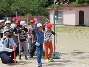 4月18日(木)に行いました。平戸警察署から1名、交通安全協会か ら2名、中野駐在所から1名来ていただきました。はじめに交通安全協会の方から、自転車に乗るときのヘルメット着用や道路の歩き方についてのお話がありました。ヘルメット着用の重要性については、実際に豆腐二丁を準備していただき、片方はそのまま、もう片方はヘルメットに入れて目の高さから落とすという実験を通して教えてくださ いました。そのまま落とした豆腐はグチャグチャになりましたが、ヘルメットに入れた豆腐は崩れることなくもとの形を維持していまし た。交通安全協会の方は、「豆腐を脳だと思って考えてみてくださ い。」とおっしゃっていました。 その後、低学年と高学年に分かれて、運動場に準備した信号を使っての歩行訓練や、七宮前の横断歩道での横断訓練をしました。歓迎遠足の前日に行うことができて本当によかったです。平戸警察署の方、交通安全協会の方、中野駐在所の方に感謝です。ありがとうございま した。