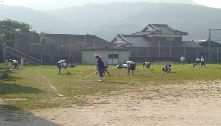 9月9日(金)の放課後に、保護者の方々と全校生徒・職員でグラウンドや校舎周辺の清掃活動(草刈り)を