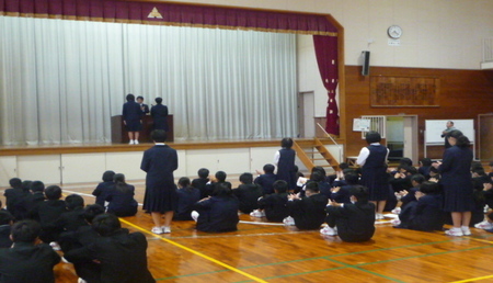- 12月5日(月)、体育館で生徒会役員改選が行われました。生徒会長候補や副会長候補、応援者が、