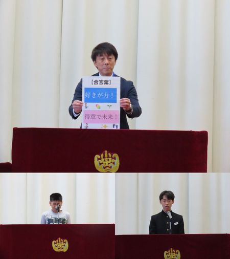 校長挨拶では、今年度の合言葉である「好きが力! 得意で未来!」の紹介を行い、そこに込めた「好きだから続けられる、得意だから挑戦できる」という思いを述べました。その後「失敗を成長に変える力・チャンスがある。みんなで良い1年にしましょう」と話しました。