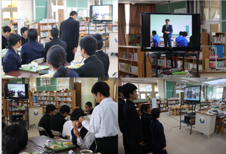 - 11月26日、全校生徒が、本校と野子中学校をインターネットで結び、黒田市長および野子中生徒とふれあい給食を行いました。生徒は、インターネットを介して黒田市長に質問をし、野子中学校にいる黒田市長から回答をいただきました。山口佳太くんは、市長が得意だった教科や勉強の仕方について質問しました。野子中学校の..