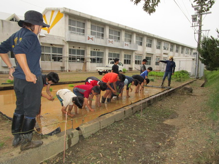 - すでに梅雨入りしていますが、本日は天候に恵まれ、無事に田植えを行うことができました。6年生は昨年度に続き2回目ということで、作業にも慣れた様子が見られました。1時間程度で作業を終えました。すばらしい体験ができました。ご指導してくださった皆さん、ありがとうございました。