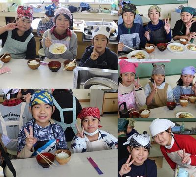 5年生は、「ご飯とみそ汁の二品を同時に仕上げることができるように、ご飯とみそ汁作りの計画を立て、おいしいご飯とみそ汁の調理をすることができる。」、6年生は、「ゆでたり、いためたりして作る主菜と副菜のための調理計画を考え、調理計画にそっておかずを作る。」ことを目的として調理実習を行いました。それぞれの学年が班で協力して、それぞれの班で考えたメニューを作ることができました。ぜひ、冬休みも家で調理をしてくれることを期待します。
